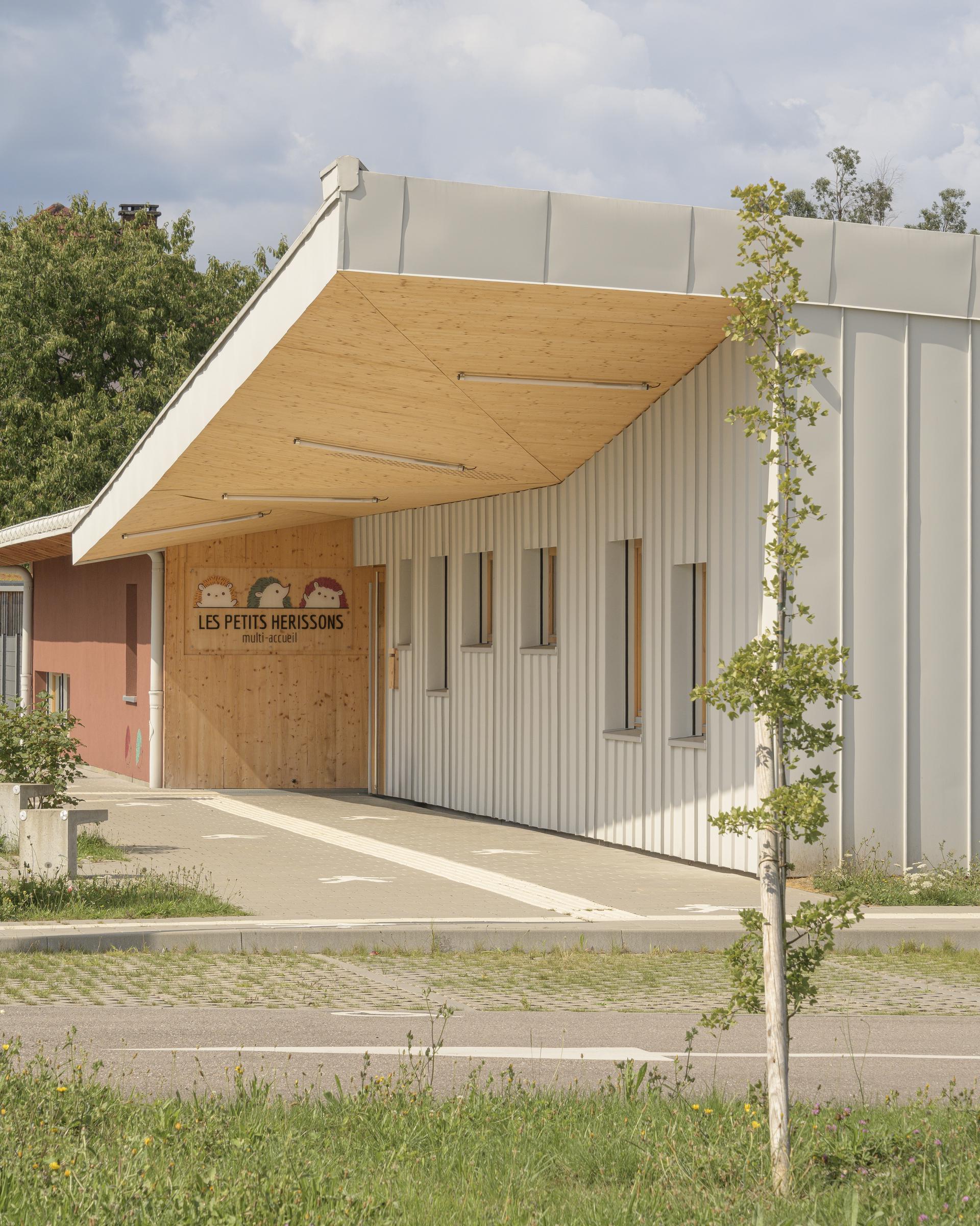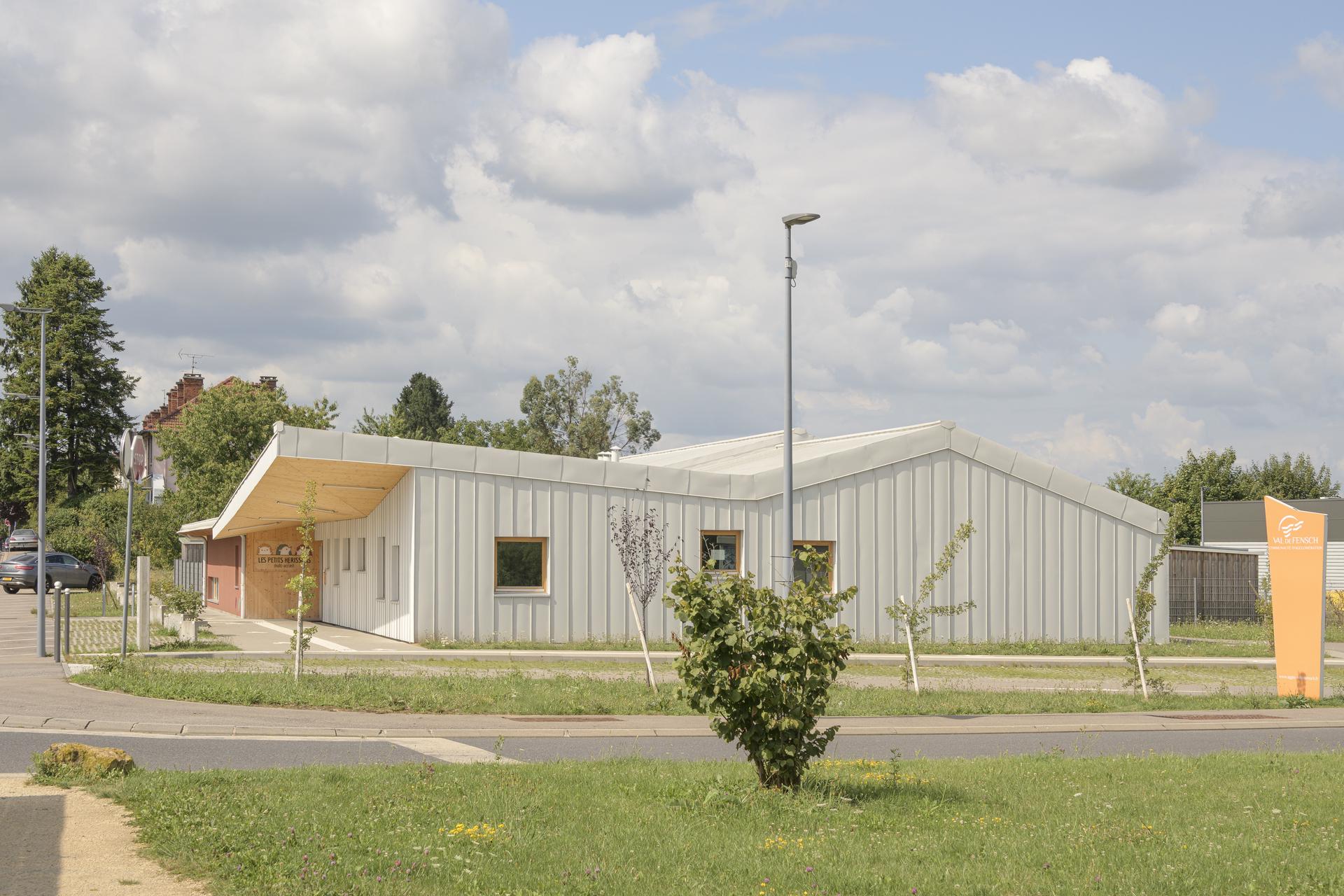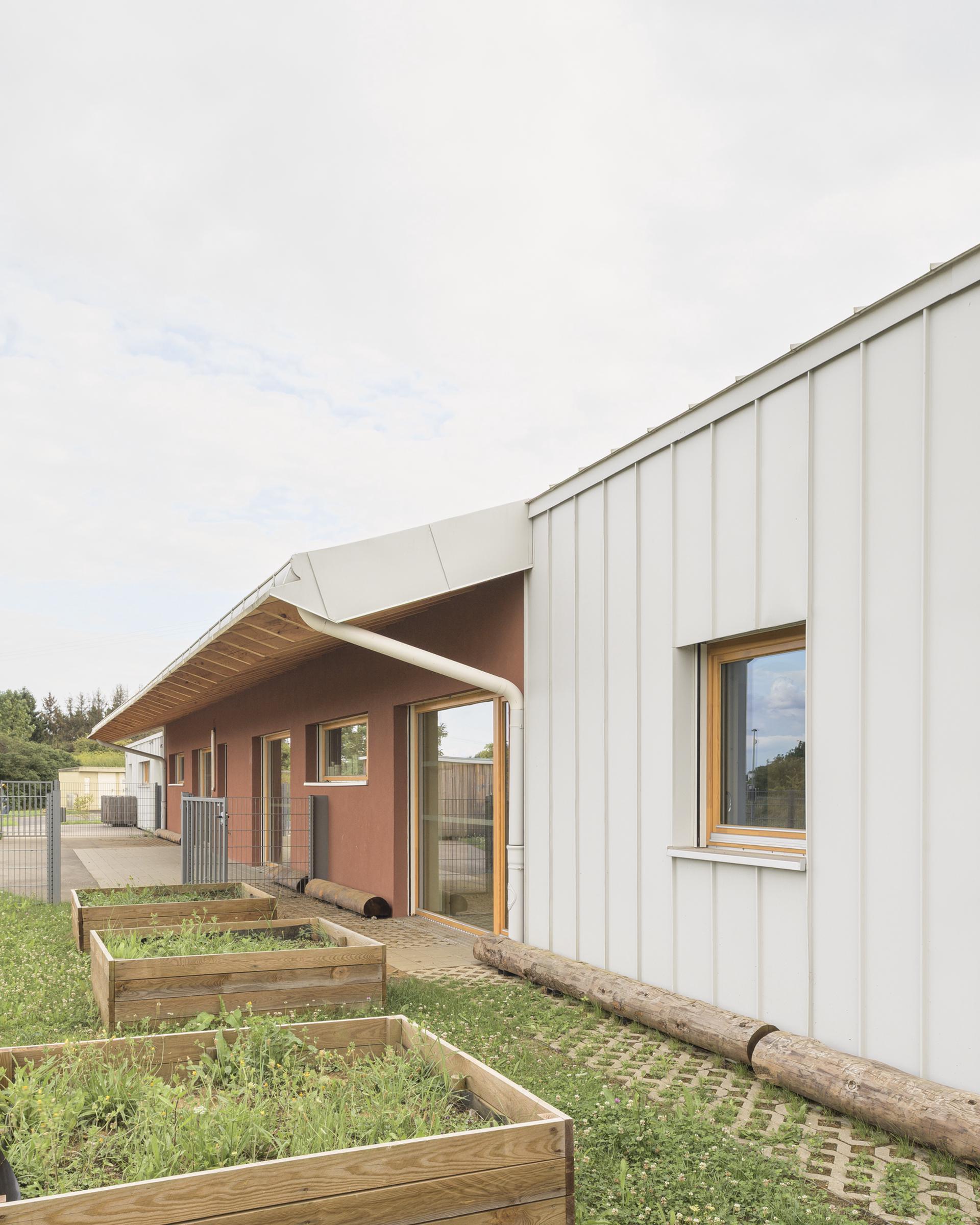 Le projet s’insère dans son site tel une maison pour les enfants. Les lieux de convivialités dédiés à l’enfant s’ouvrent au Nord, Nord-Est et Nord-Ouest et se développent dans la continuité des espaces servants. Ces derniers protèges des nuisances au SUD. La volumétrie toute en longueur s’inscrit dans le site en douceur. Deux volumes se décalent au Nord-Ouest pour diversifier les orientations, les ambiances et les usages au fil de la journée. Les espaces intérieurs possèdent des baies à hauteur d’enfant. L’ensemble des revêtements intérieurs sont naturels : linoleum, menuiserie bois huilé. La construction est majoritairement en ossature bois isolée avec de la ouate de cellulose et de la fibre de bois.