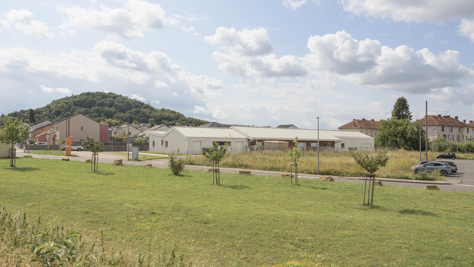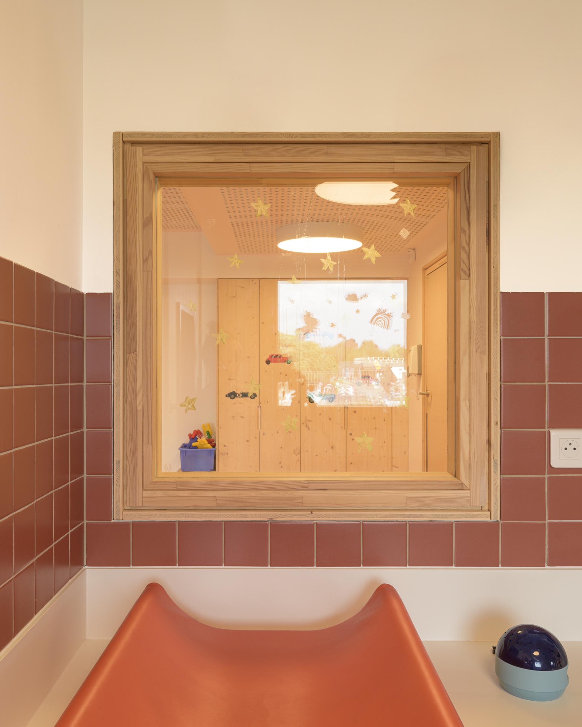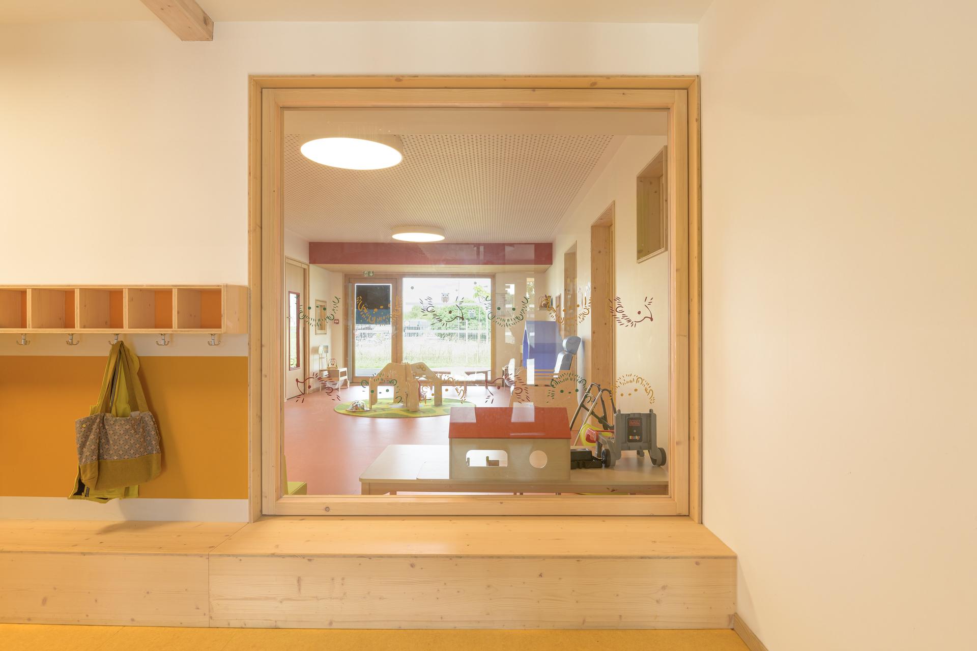 Le projet s’insère dans son site tel une maison pour les enfants. Les lieux de convivialités dédiés à l’enfant s’ouvrent au Nord, Nord-Est et Nord-Ouest et se développent dans la continuité des espaces servants. Ces derniers protèges des nuisances au SUD. La volumétrie toute en longueur s’inscrit dans le site en douceur. Deux volumes se décalent au Nord-Ouest pour diversifier les orientations, les ambiances et les usages au fil de la journée. Les espaces intérieurs possèdent des baies à hauteur d’enfant. L’ensemble des revêtements intérieurs sont naturels : linoleum, menuiserie bois huilé. La construction est majoritairement en ossature bois isolée avec de la ouate de cellulose et de la fibre de bois.